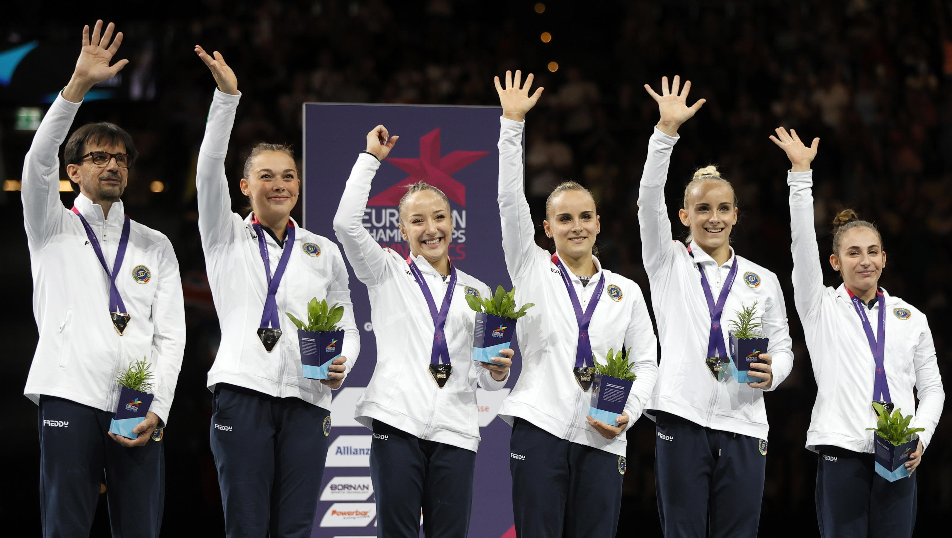 ROMA, 13 AGO - La Squadra nazionale Italiana senior di Ginnastica Artistica Femminile ha conquistato la medaglia d'oro ai campionati europei in corso a Monaco di Baviera. Dopo il titolo individuale all-around con Asia D'Amato e il titolo del Team Junior di ieri, oggi sono state Asia D'Amato, Martina Maggio, Alice D'Amato, Giorgia Villa, Angela Andreoli a salire sul gradino più alto del podio.