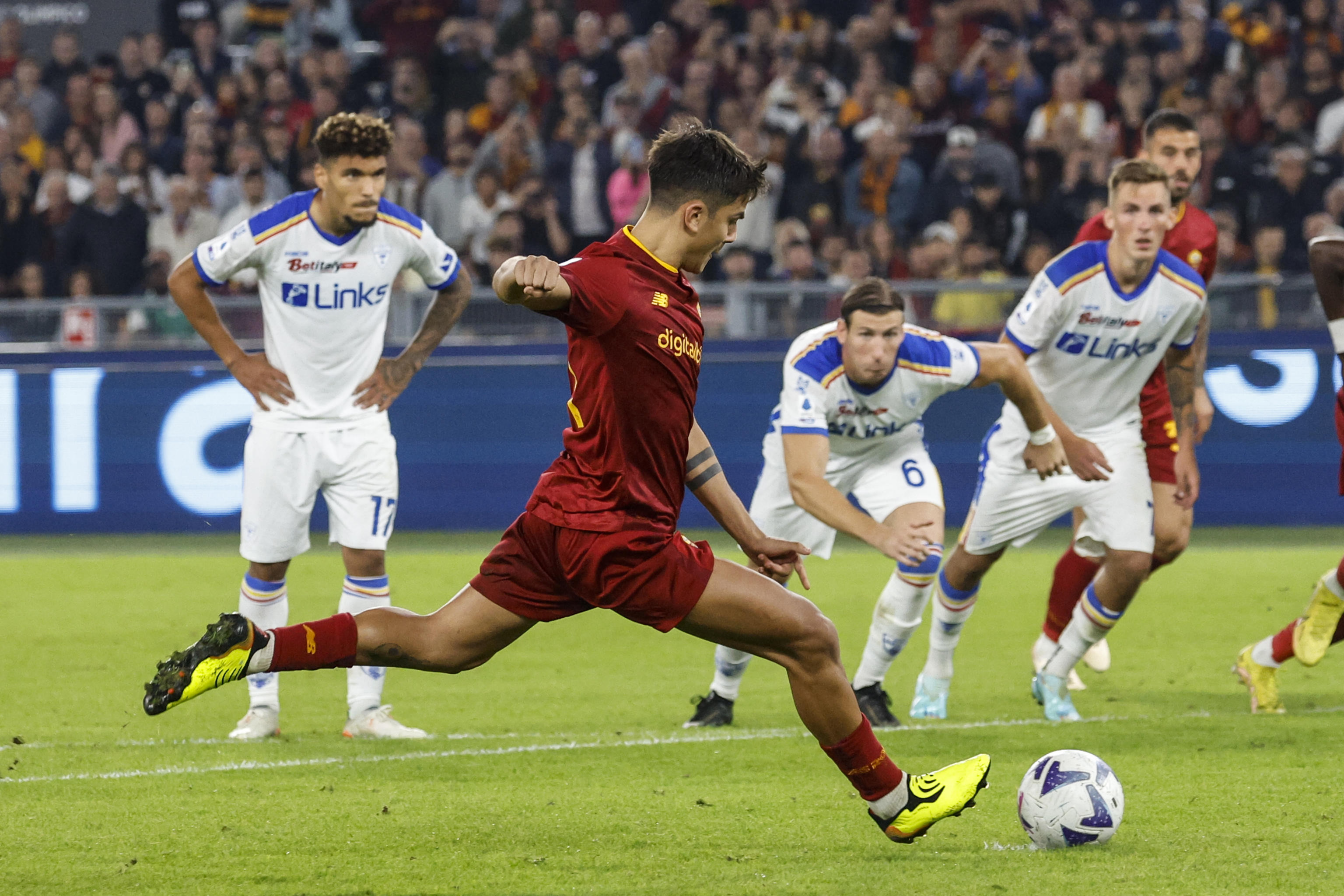 ROMA, 09 OTT - Roma batte Lecce 2-1 (1-1) nel posticipo odierno della 9/a giornata d'andata del campionato di calcio di Serie A disputato sul terreno dello stadio Olimpico di Roma. I gol: nel primo tempo Smalling per la Roma al 6' e Strefezza per il Lecce al 39'; nel secondo tempo Dybala per i giallorossi su rigore al 3'. Al momento di calciare dal dischetto il fantasista argentino si è fatto male a un muscolo della gamba ed è stato costretto a uscire dal campo. La squadra di José Mourinho ha giocato dal 22' pt in superiorità numerica per l'espulsione di Hjulmand, dopo un intervento falloso su Belotti.