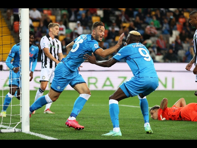 (ANSA) - UDINE, 20 SET - Il Napoli ha battuto l'Udinese 4-0 nel posticipo della quarta giornata del campionato di serie A e ora è solo in testa alla classifica a punteggio pieno. Azzurri due volte in gol nel primo tempo, con Osimhen al 24' e al 35' con Rrahmani. A inizio ripresa, la rete di Koulibaly e nel finale il poker di Lozano. (ANSA).