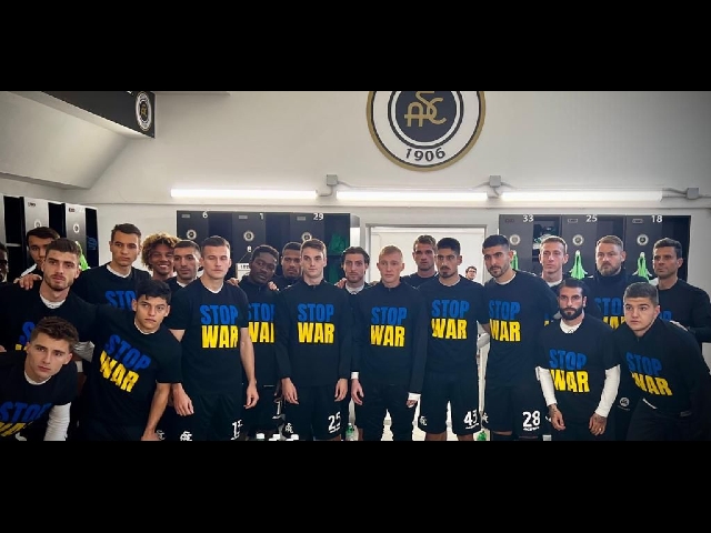 (ANSA) - LA SPEZIA, 27 FEB - Spezia in campo con una maglia con scritto "Stop War" nei colori della bandiera ucraina durante il riscaldamento della partita casalinga contro la Roma. I giocatori del club ligure hanno voluto lanciare un messaggio di vicinanza al popolo ucraino e al proprio calciatore Viktor Kovalenko, originario della Crimea contro l'invasione della Russia. (ANSA).