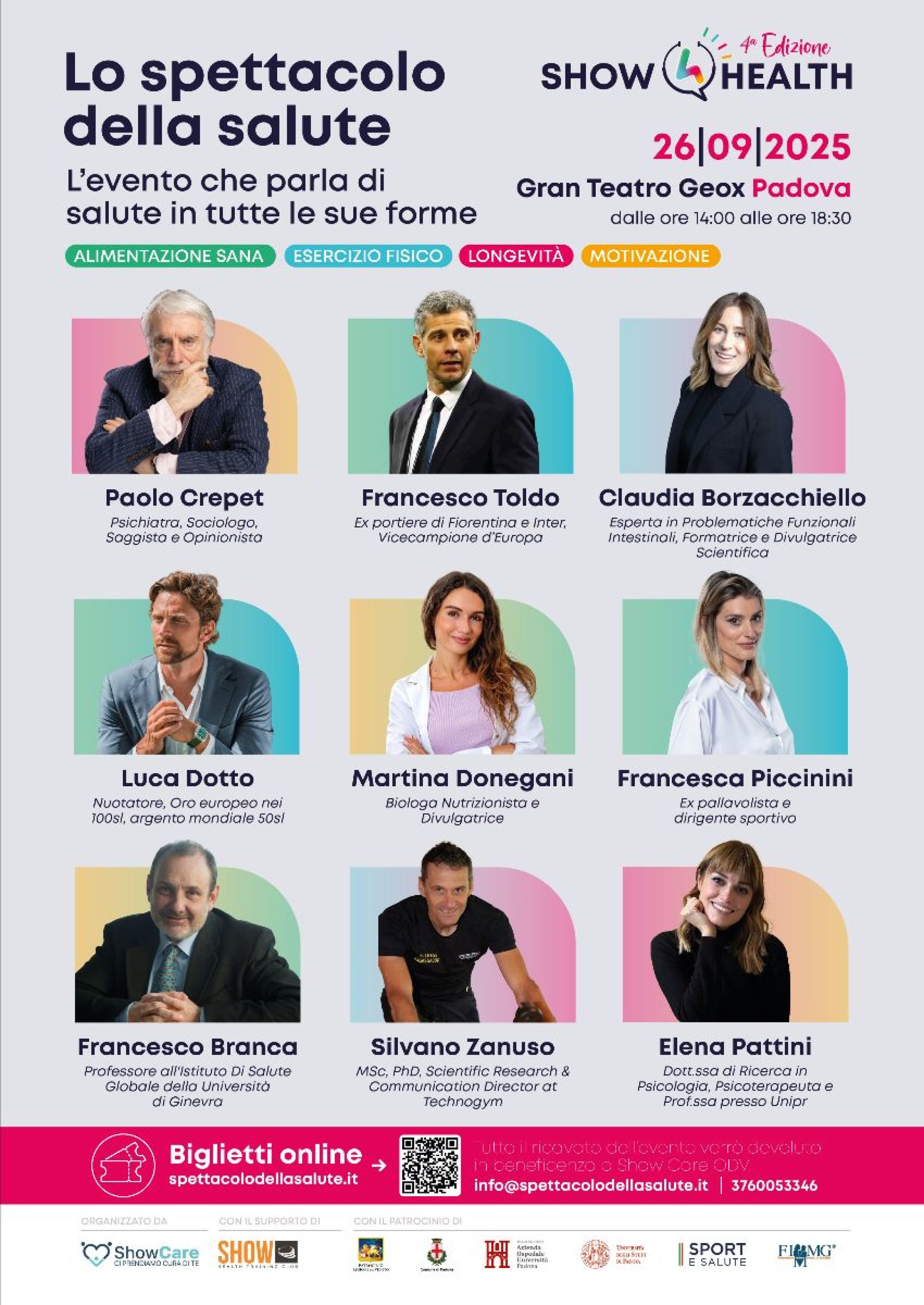 ROMA, 24 SET - Quando la salute diventa spettacolo. Venerdì 26 settembre, dalle 14.15 alle 18.30, il Gran Teatro Geox di Padova è pronto a trasformarsi in un palcoscenico unico dove prevenzione, testimonianze e show si intrecciano. La 4ª edizione de Lo Spettacolo della Salute conferma il suo format innovativo: non una conferenza, ma un vero e proprio talk-show che rende la salute accessibile, coinvolgente e memorabile. A rendere speciale l'appuntamento saranno dieci protagonisti d'eccezione, figure che hanno segnato la storia dello sport e della cultura: la leggenda del volley Francesca Piccinini, lo psichiatra e sociologo Paolo Crepet, l'icona del calcio Francesco Toldo, il campione di nuoto Luca Dotto, e la straordinaria Emma Mazzenga, padovana capace di infrangere record mondiali over 90 e già oggetto di studi internazionali. Con loro, esperti come la nutrizionista Martina Donegani, il prof. Francesco Branca (OMS), lo scienziato Silvano Zanuso (Technogym), la psicologa Elena Pattini e la docente Claudia Borzacchiello, a testimoniare come la prevenzione sia un percorso che riguarda tutti. Guidato dalla giornalista Chiara Perale, il programma si svilupperà in quattro panel tematici — alimentazione, esercizio fisico, longevità e motivazione — alternando dati scientifici, storie personali e riflessioni capaci di lasciare il segno. Oltre allo spettacolo sul palco, l'evento ha un obiettivo concreto: il ricavato dei biglietti (10€) sarà interamente devoluto a Show Care, organizzazione che offre gratuitamente percorsi personalizzati di esercizio fisico per persone in follow-up oncologico. Un biglietto che diventa quindi un gesto di solidarietà, utile a finanziare l'ampliamento dei servizi e nuovi progetti di ricerca. Con il patrocinio della Regione Veneto, del Comune e dell'Università di Padova, "Lo Spettacolo della Salute" si candida a essere il punto di riferimento di una nuova cultura della prevenzione, capace di unire comunità, istituzioni e cittadini sotto un unico messaggio: prendersi cura di sé è un atto di coraggio collettivo.