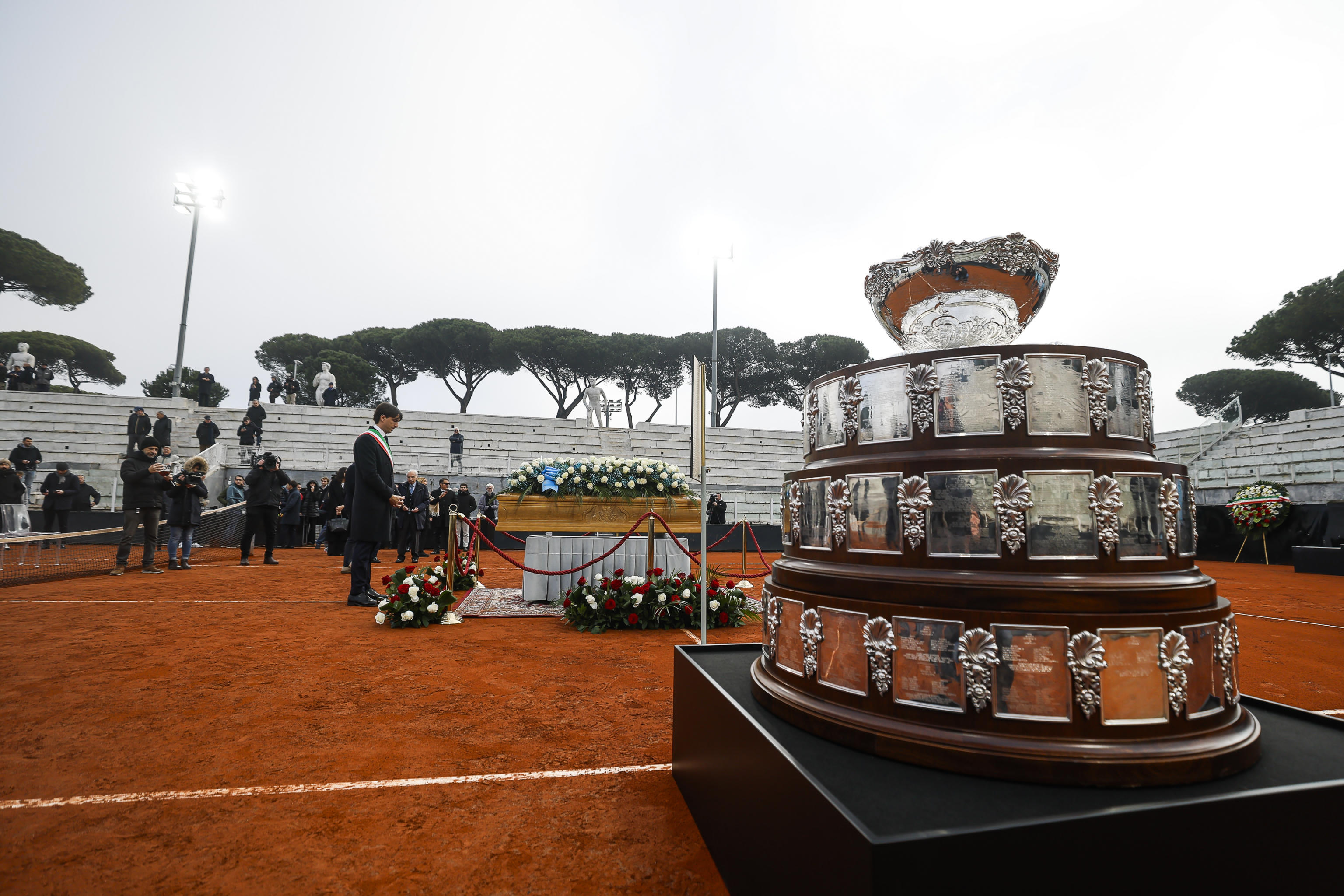 ROMA, 03 DIC - "Questo stadio si doveva intitolare a lui, l'ho fatto volentieri". Lo ha detto Gianni Petrucci, oggi presidente Fip, presente alla camera ardente di Pietrangeli e che da n.1 del Coni fece intitolare il campo del Foro Italico all'ex campione di tennis. Per Alessandro Onorato, Assessore ai Grandi Eventi, Sport, Turismo e Moda di Roma, Pietrangeli "era un'icona di stile" e "anche le sue critiche dimostrano l'intelligenza della persona che resterà eterna". Uno dei figli di Pietrangeli, Filippo, invece, lo definisce "il nonno del tennis di oggi", mentre non entra nel merito delle condoglianze di Sinner effettuate in forma privata perché "ognuno fa quello che sente". Tantissime poi le corone mandate, da quella della federazione tennis e padel a quella di Sport e Salute, fino allo stendardo della Lazio calcio. Davanti al feretro anche due racchette una di quando vinceva e l'altra con cui ha partecipato a Tennis&Friends.