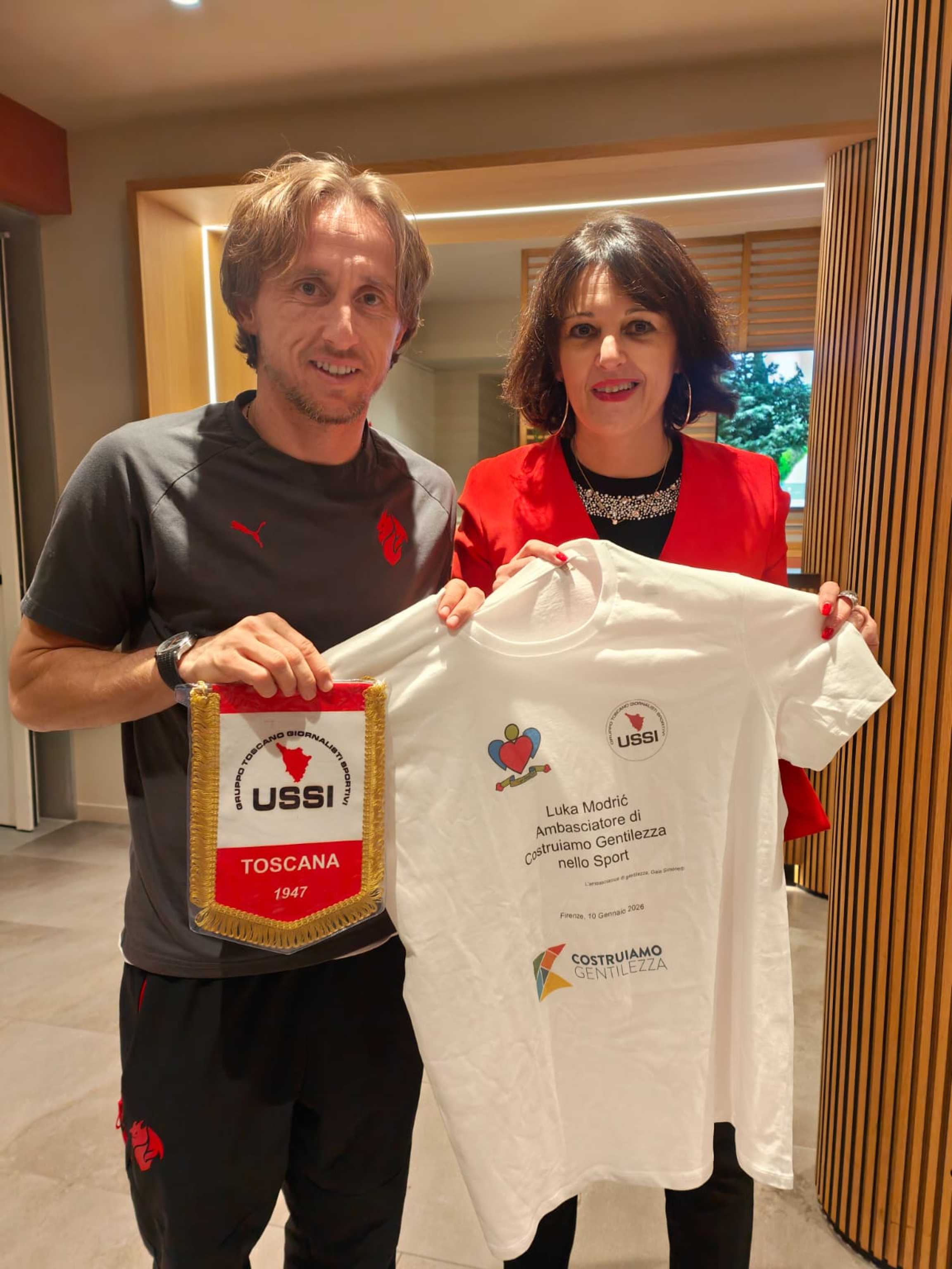 ROMA, 12 GEN - A Luka Modrić è andato il Premio Costruiamo Gentilezza nello sport. A consegnarlo, alla vigilia del match Fiorentina- Milan al giocatore rossonero e Pallone d'Oro, è stata la giornalista Gaia Simonetti, responsabile progetti speciali di Ussi Toscana (Gruppo Giornalisti Sportivi) e ambasciatrice di Costruiamo Gentilezza. A segnalare il calciatore del Milan come meritevole del riconoscimento sono stati i bambini e le bambine che lo hanno definito un " campione gentile nella vita e in campo". Il simbolo del Premio è una maglia disegnata dai bambini che diventa una sorta di investitura ad ambasciatore di gentilezza. Il Premio Costruiamo Gentilezza nello Sport, nato nell'autunno del 2022, ha preso ispirazione dal un gesto di cuore del primiero Giglielmo Vicario che accolse una famiglia fuggita dalla guerra. Nei suoi primi 3 anni di vita, il Premio ha percorso chilometri, ha raggiunto più città e andando a oltre 30 uomini e donne di sport. È diventato un " narratore" del bello che lo sport ci può fare arrivare. Modrić, inoltre, assieme al Milan, è stato protagonista di un altro gesto bello. Ha inviato un messaggio di vicinanza e sostegno ad un giovane tifoso rossonero, sopravvissuto alla tragedia di Crans- Montana.