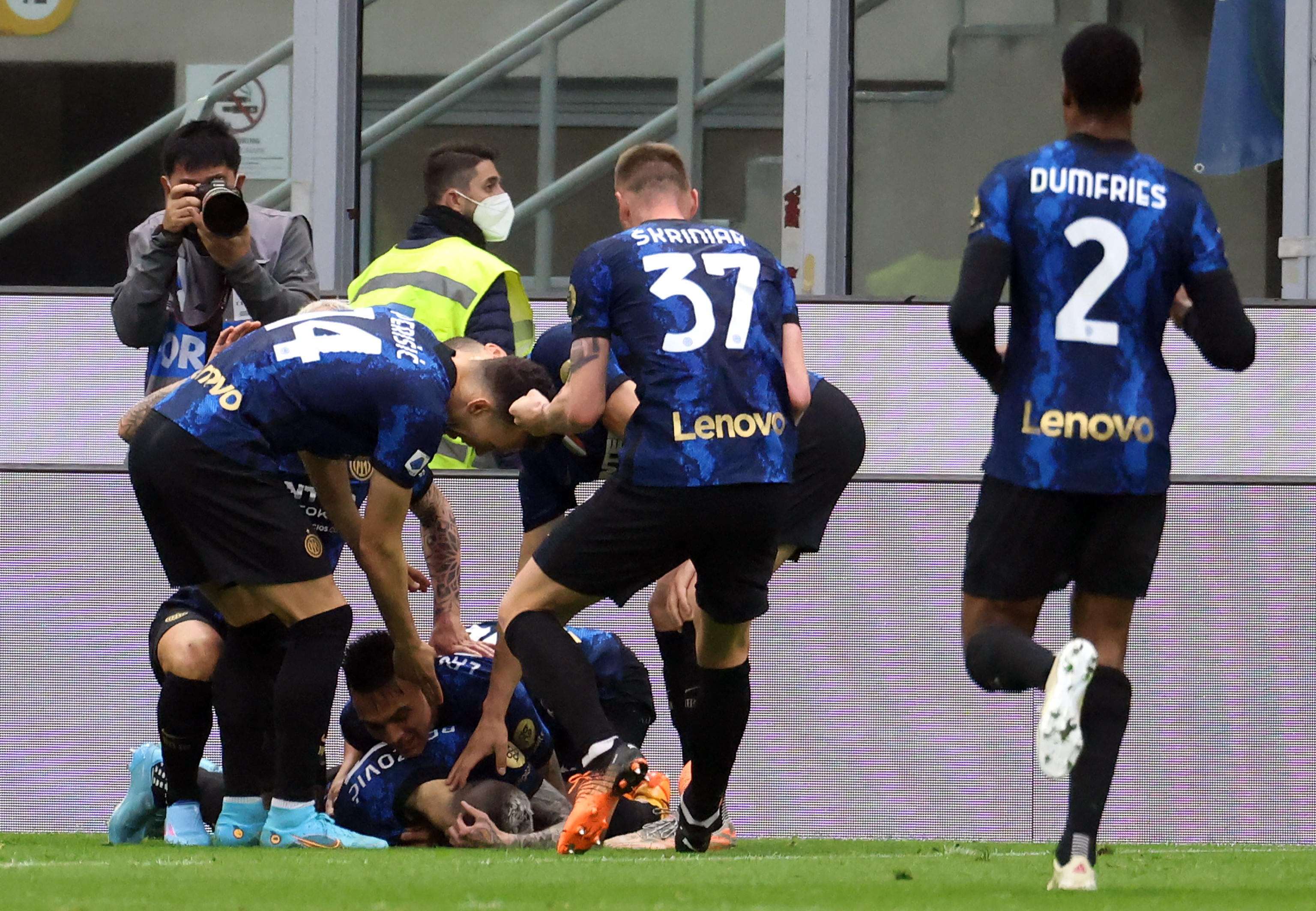 (ANSA) - ROMA, 23 APR - Festa a grande a San Siro, ed è tutta per l'Inter. Davanti a oltre 70mila spettatori i nerazzurri hanno battuto 3-1 la Roma dell'ex Mourinho e si prendono il comando momentaneo della classifica. La squadra di Simone Inzaghi vola a quota 72 punti, scavalcando il Milan chiamato domani a vincere nel posticipo con la Lazio. Ad aprire le marcature Dumfries al 30' del primo tempo, il raddoppio dell'Inter lo firma Brozovic al 40'. Nella ripresa il tris arriva con Lautaro (7'): la rete dei giallorossi al 40' con Mkhitaryan. (ANSA).