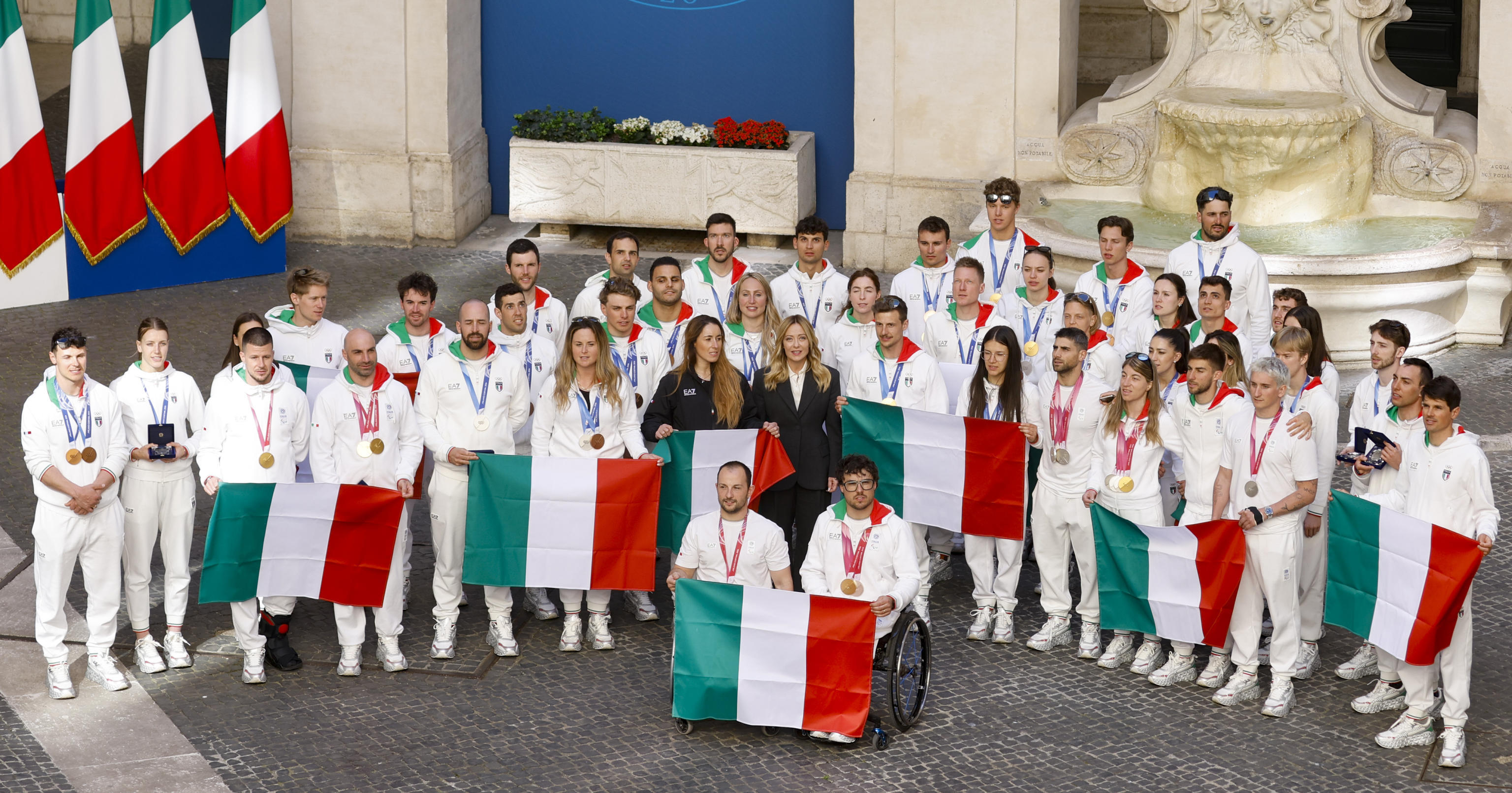 Nel corso dell'incontro, durato poco meno di trenta minuti, gli atleti hanno firmato il tricolore con il Cip che ha regalato una rappresentazione della fiamma dei Giochi mentre la premier, dopo aver stretto la mano a tutti ed esortato gli atleti ad andare avanti su questa strada, ha consegnato loro un cofanetto con il tricolore. Gli azzurri, poi, hanno lasciato la piazza tra gli applausi dei tifosi.