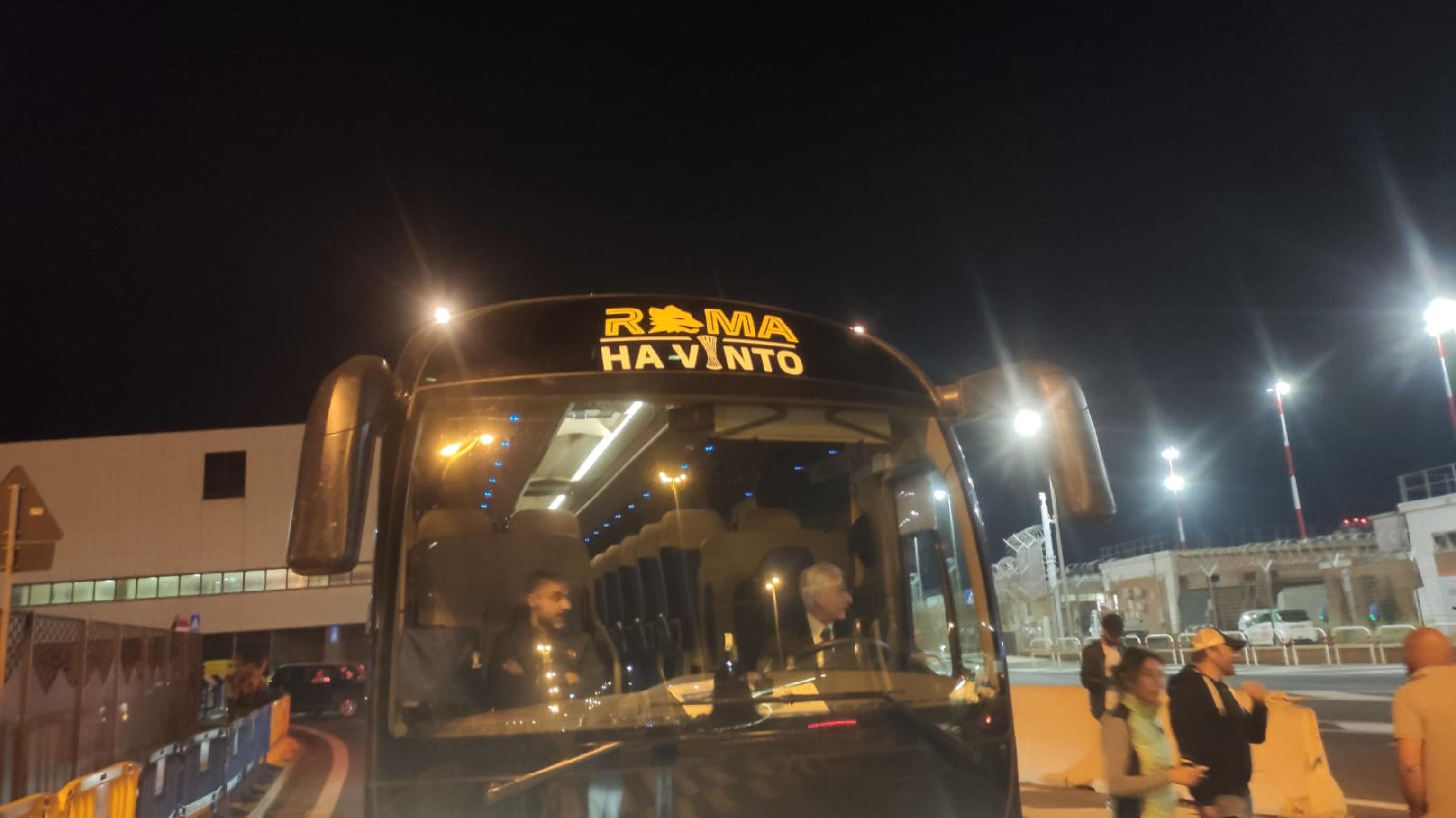 Squadra e staff sono quindi saliti a bordo del pullman ufficiale della squadra con lo slogan "Roma ha vinto" sulla livrea, che - scortato - ha lasciato lo scalo da un varco secondario. Nessun contatto diretto tra squadra e tifoseria.